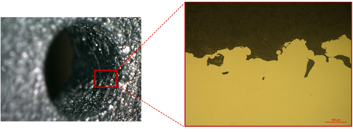 Microstructure along the walls of a hollow feature on an additively manufactured titanium Ti-6Al-4V part showing improper fusion of powders.