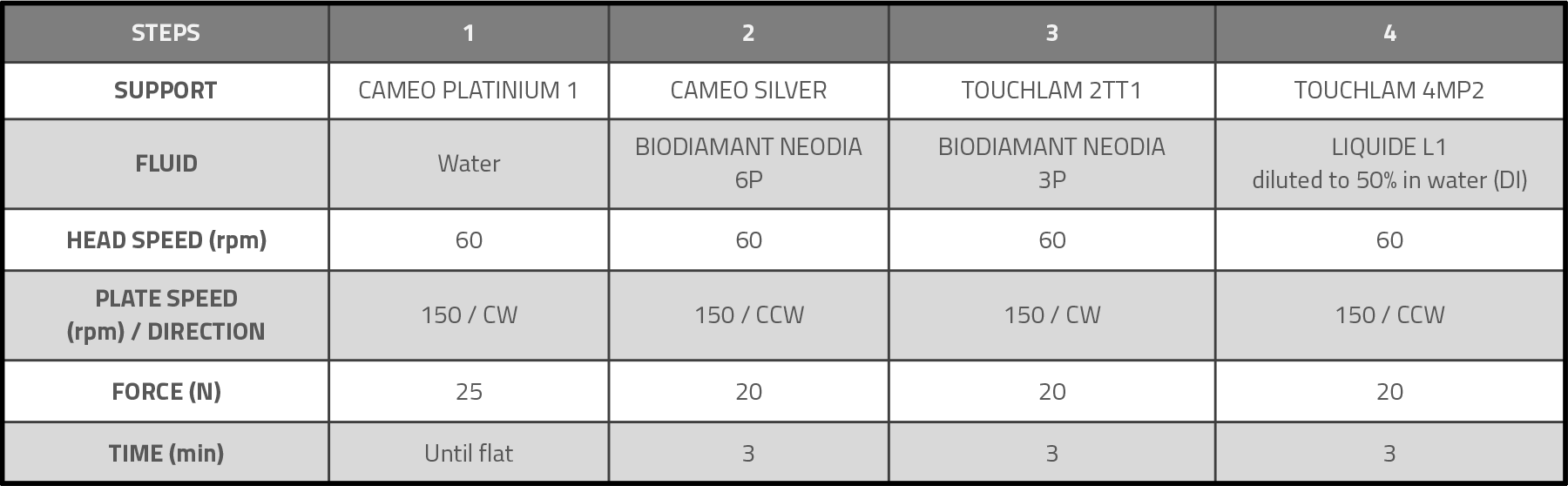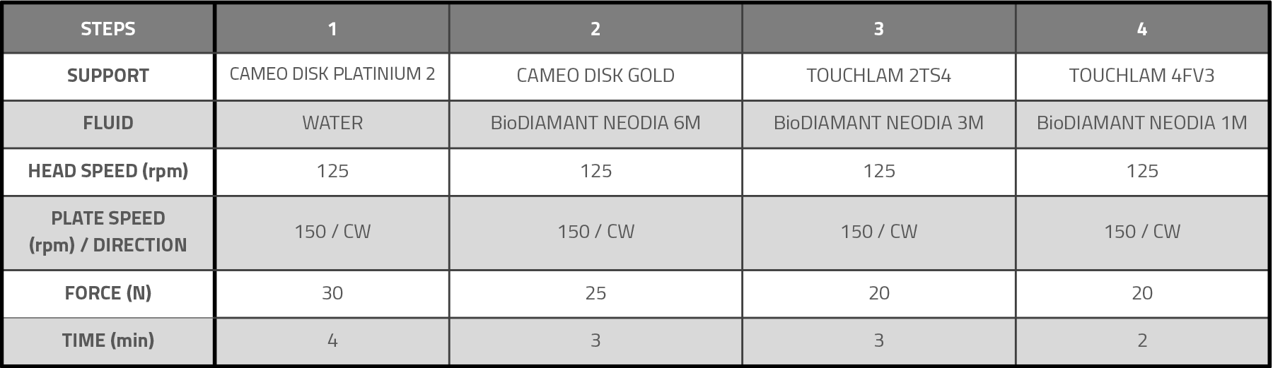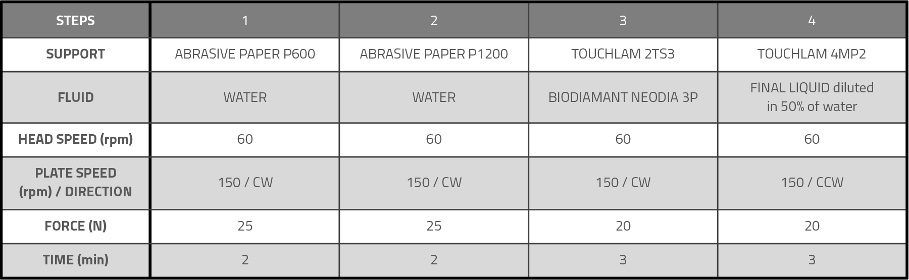 CW – Clockwise / CCW – Counter Clockwise / Head direction: CW (the procedure is presented of polishing 6 mounted samples of diameter 30 mm)