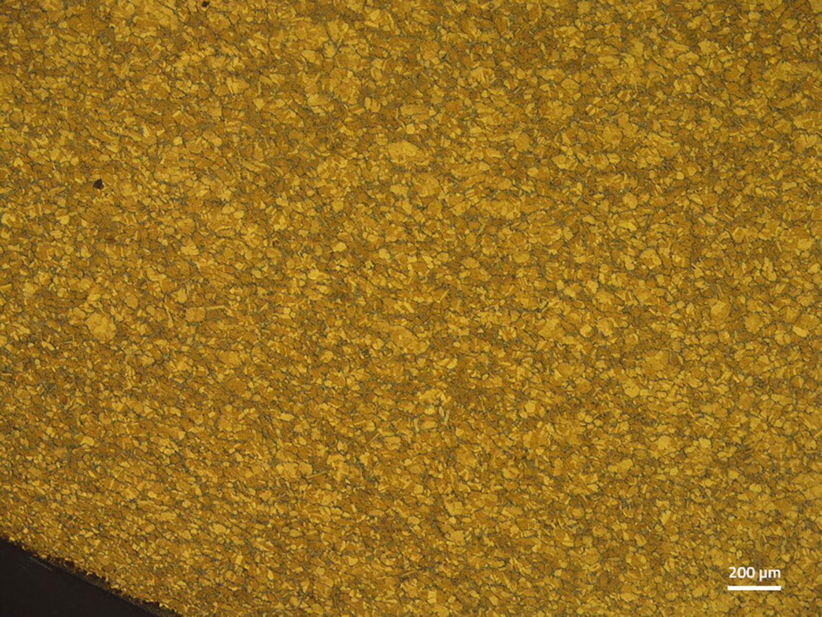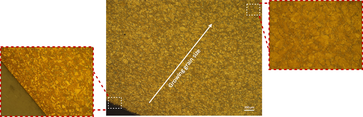 Depending on the treatment parameters the alloy is subjected to, such as annealing temperature, grains can recrystallize or grow. When the temperature distribution in the part is not uniform, the grains sizes can vary. The same phenomenon can occur from extrusion or rolling loads. Considering that copper alloys deform easily, the grain size variation can play a critical role in deciding the mechanical properties of the final part.