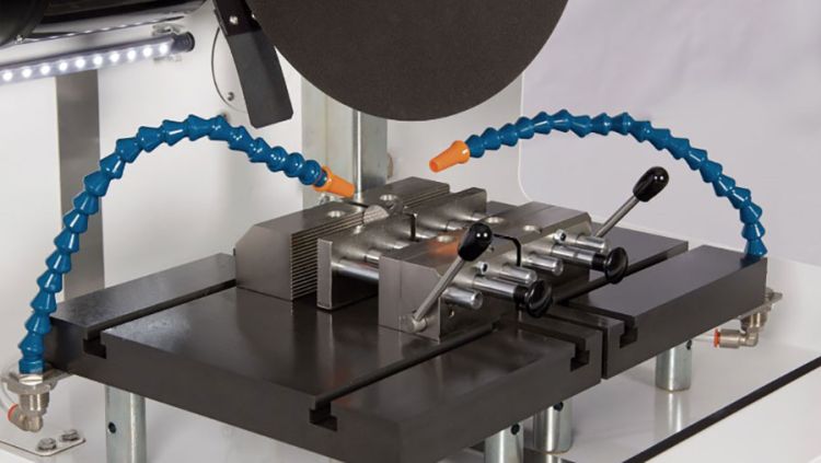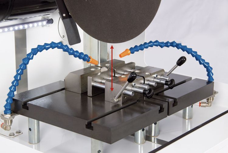 The cutting table is the platform where the sample is tightened using a vise. Two aspects characterize a cutting table: the size and the number of slots. The bigger the cutting table, the bigger the samples that can be fixed. The more the slots, the better is the flexibility to adapt the positions of vises.