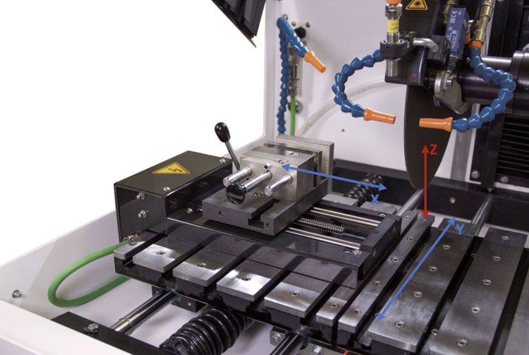 Degrees of freedom of the table and wheel in a typical metallographic cutting machine – X, Y, and Z axes. The table movement is generally limited to X and Y axes (Blue arrows) and the cutting wheel generally moves on the Z-axis (red arrow).