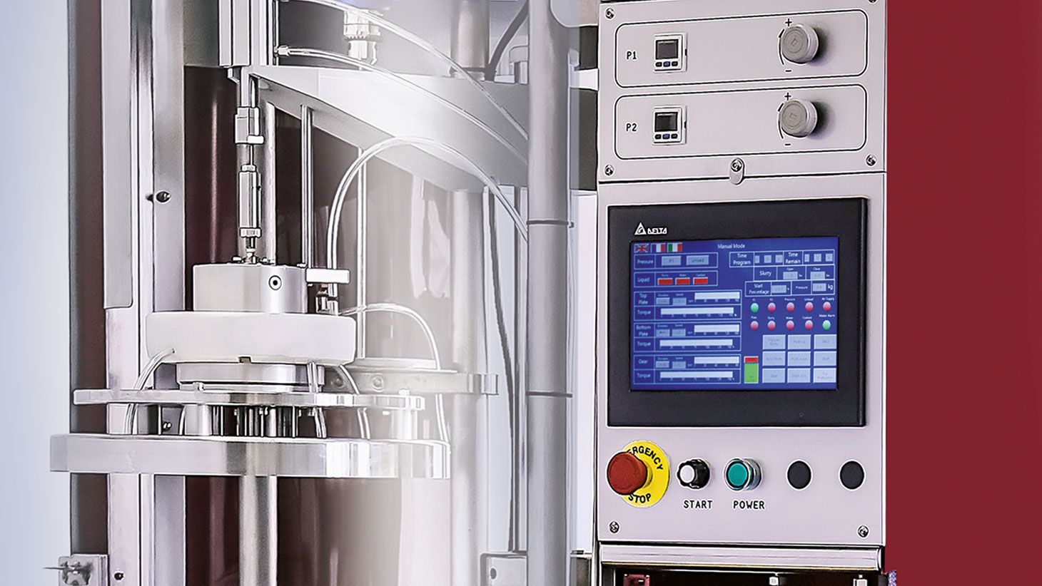 L’entraînement des plateaux (inférieur et supérieur) et du pignon central est assuré par des moteurs brushless. La variation des vitesses et des sens de rotation est donc possible. Les plateaux d’un diamètre extérieur de 380 mm autorisent la mise en place de 5 satellites (de capacité utile Ø 125 mm).