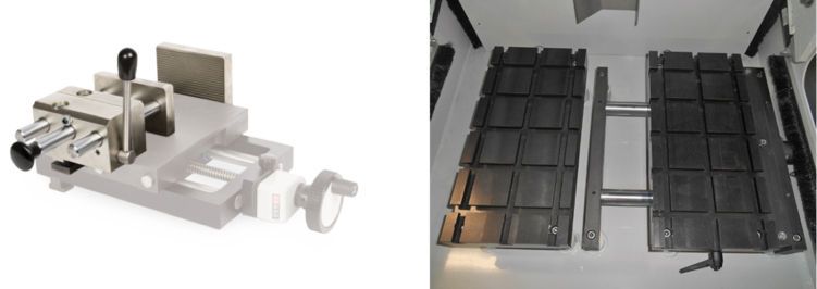 Selon la forme de l’échantillon et le type de la table de découpe, une grande variété de systèmes de fixation est disponible. Pour des découpes de précision, il est possible de fixer sur la table de découpe une table transversale axe X. Les avantages de ce type de table sont présentés dans un prochain paragraphe de cet article.
