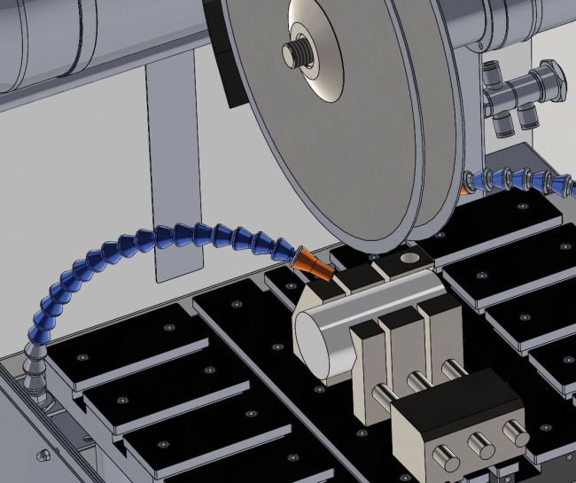 Le liquide de refroidissement joue un rôle essentiel pour minimiser les dommages structurels du matériau et limiter l’échauffement lors de la découpe. Le système de refroidissement utilise généralement un système de recirculation muni d’un filtre pour arroser continuellement la zone de coupe par des tubes de refroidissement.
