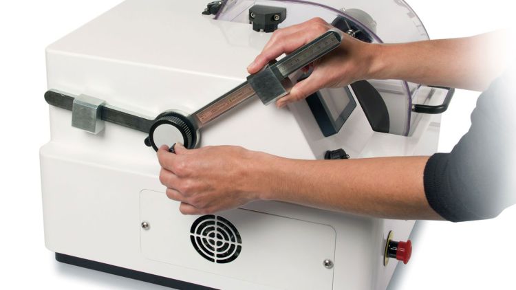 Mécanisme de coupe par gravité sur une machine de coupe permettant d’effectuer l’opération de coupe avec une force minimale. Les masselottes coulissantes sont utilisées pour manipuler la force descendante appliquée sur l’échantillon. Le bouton est utilisé pour manipuler la position de l’échantillon dans la direction axe X.