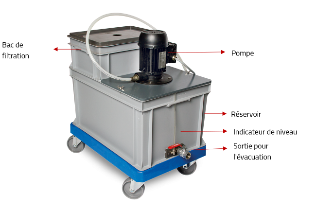 - Un réservoir avec une pompe qui contient et fait recirculer le fluide de tronçonnage