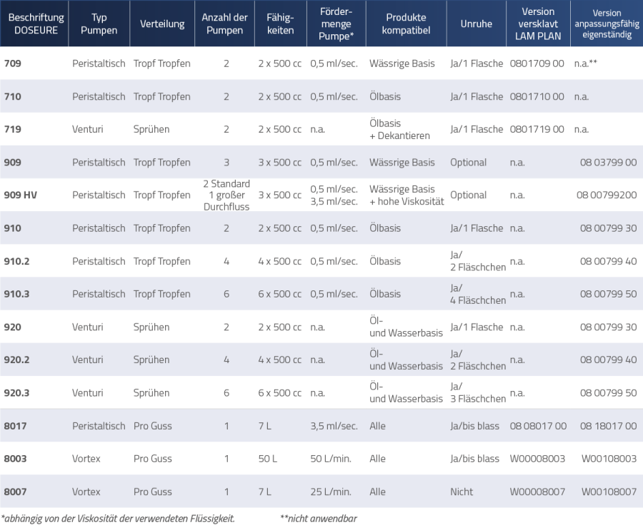 - Verteilersystem: Düsen sind nicht im Lieferumfang enthalten, siehe Tabelle für die einzelnen Maschinen.