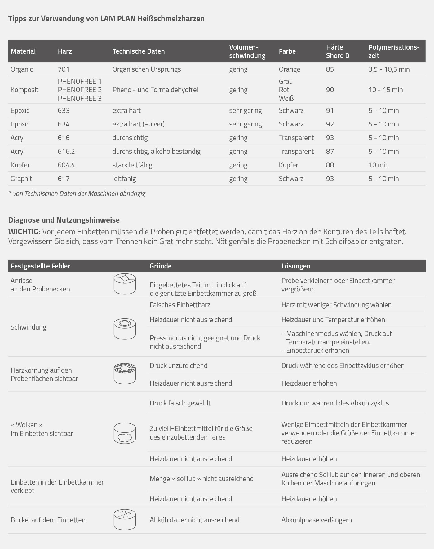 Um alle Situationen in der Forschung oder metallographischer Untersuchungen bedienen zu können, hat LAM PLAN eine Warmharze- Auswahl entwickelt. Jedes Harz zeichnet sich durch ganz besondere physikalische und chemische Eigenschaften aus.
