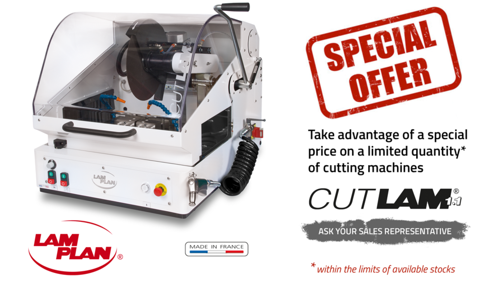 Take the opportunity to equip your laboratory or renew your machine park with this exceptional price on our famous CUTLAM 1.1 cutting machine, renowned for its power, versatility and reliability.