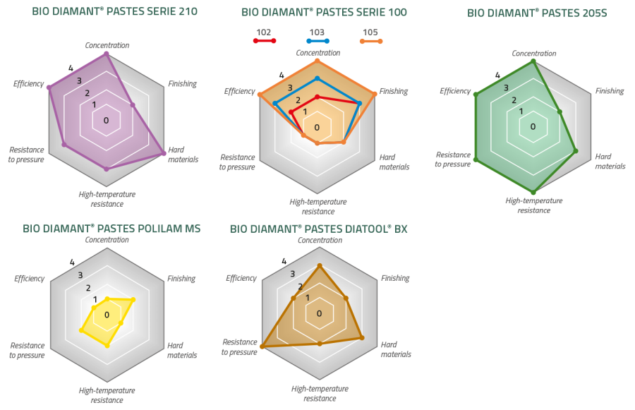Depending on your criteria, the diagrams below will help you to choose the most suitable diamond paste.