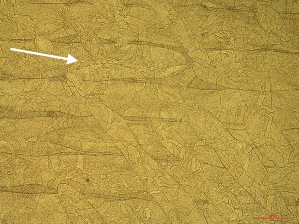 Microstructural defect (red arrow) from improper fusion of layers in additively manufactured steel 316L alloy.