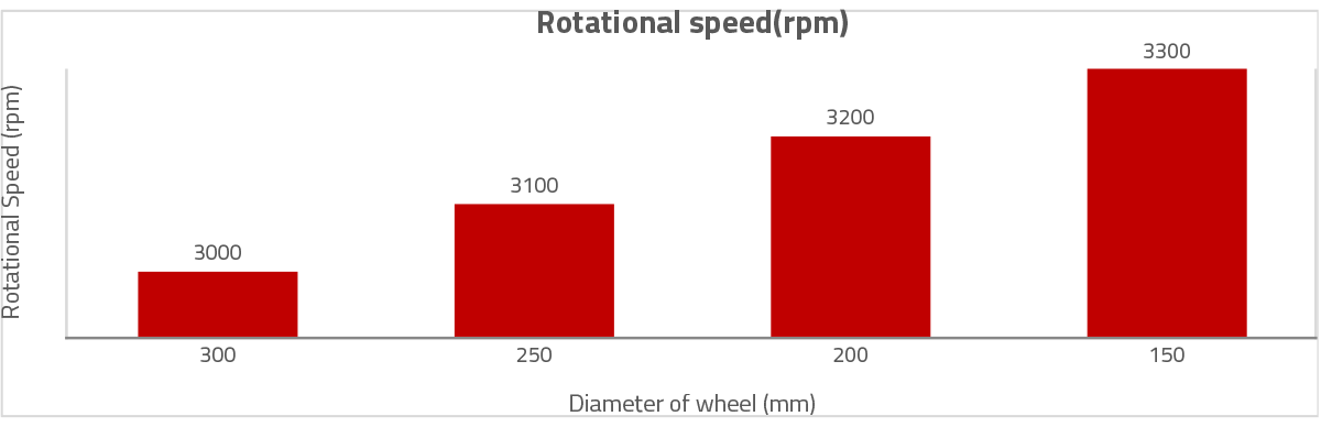Among the various parameters, the rotational speed of the wheel and feed speed are the most important. The chart below presents the optimal rotational speed based on the diameter of the cutting wheel.