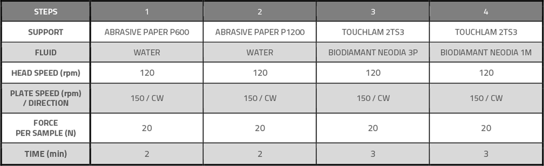 Once the samples are flat, they can be pre-polished/polished. Lamplan Touchlam 2TS3 are very effective when used with Neodia abrasives on PMCs. The pad also maintains the samples flat during the polishing process.