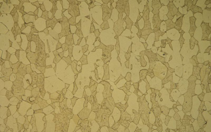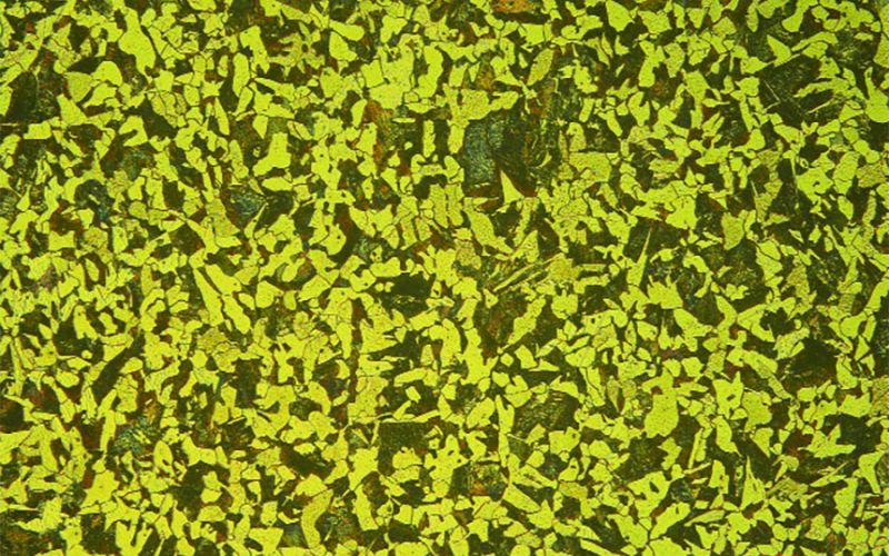 Microstructure d’un acier bas carbone laminé qui contient des bandes de perlite régulières et discontinues.