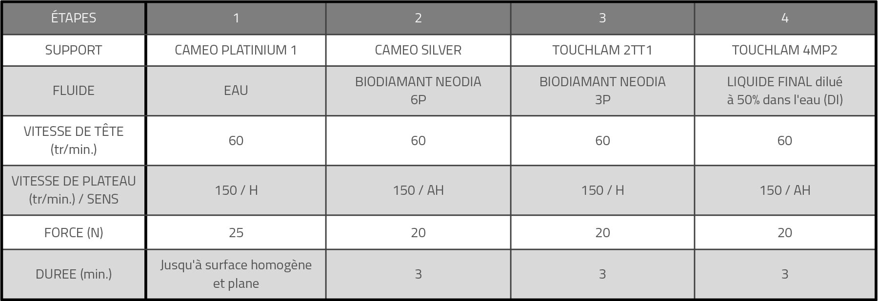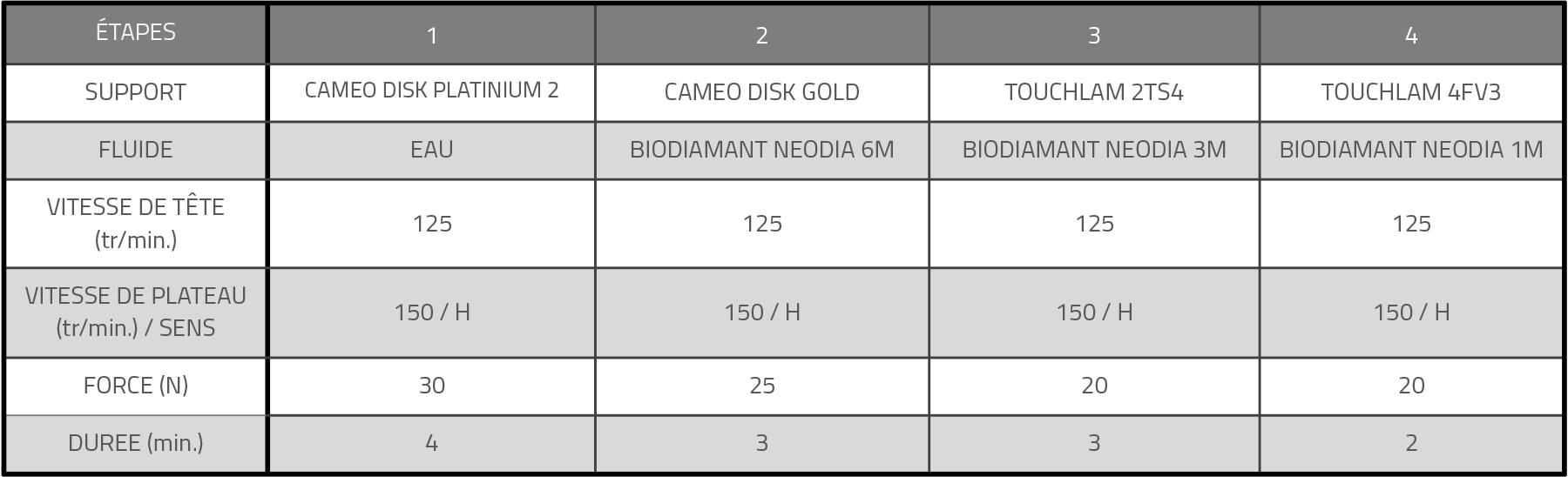 H – Horaire / AH – Anti-Horaire / SENS DE TÊTE : Toujours H (les paramètres sont optimisés pour polir 6 échantillons de diamètre 30 mm).