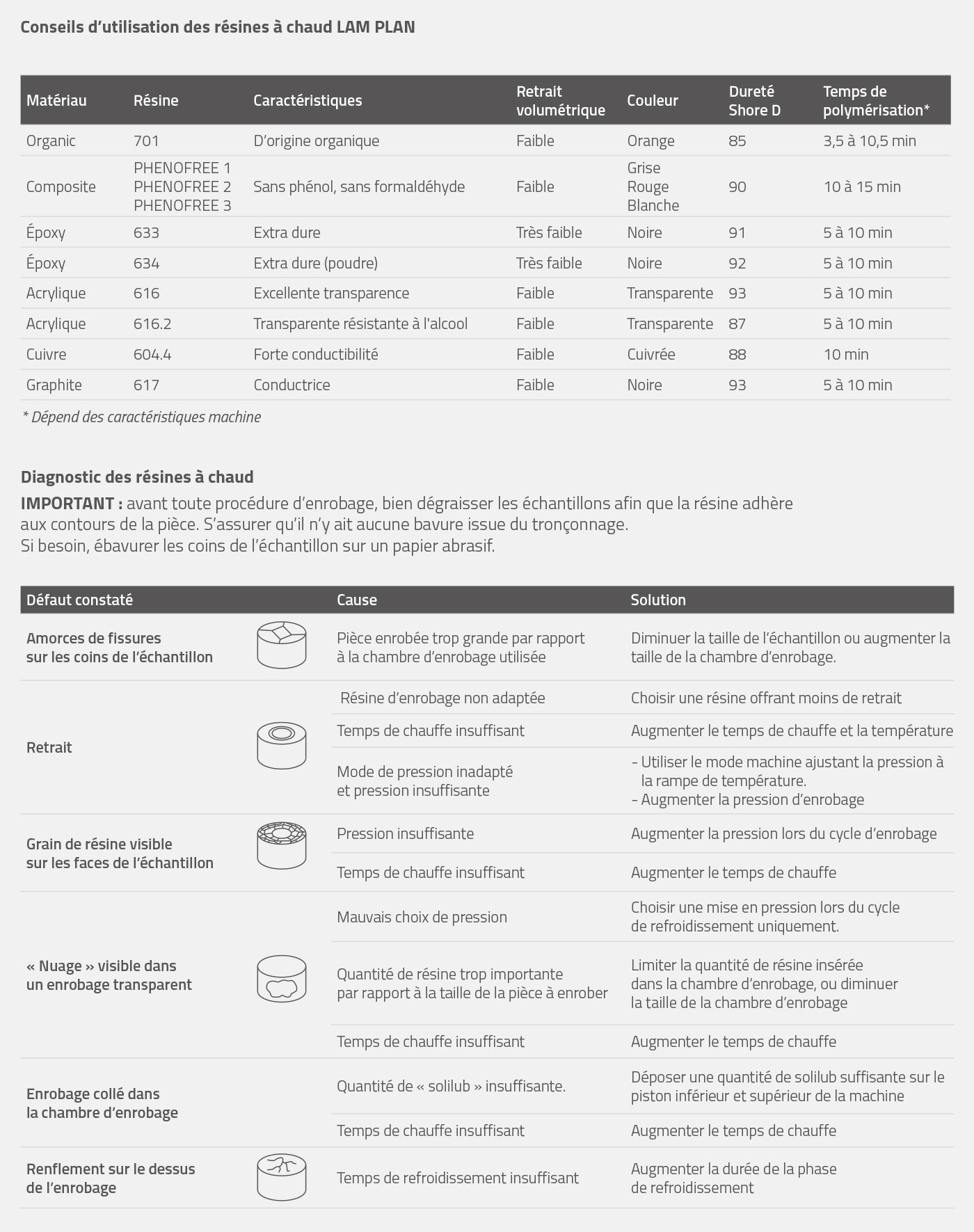 Pour répondre à toutes les situations en recherche et contrôle métallographique, LAM PLAN a développé et testé une gamme de résines à chaud qui permet d’obtenir des enrobages parfaitement adaptés quelle que soit l’étude entreprise.