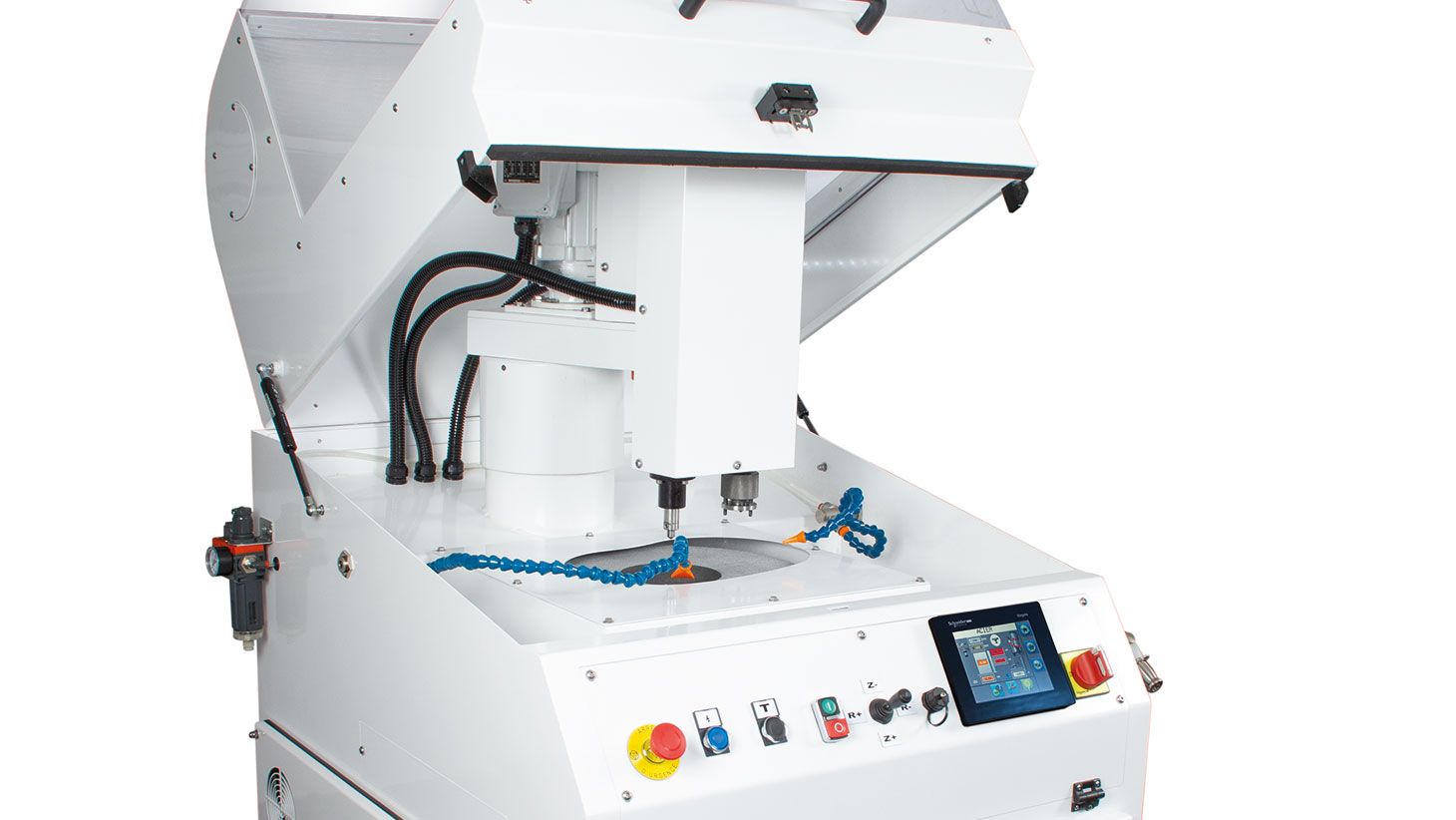 L’axe Z assure la montée/descente motorisée de l’outil de dressage et la mise en pression pneumatique du porte-échantillons.