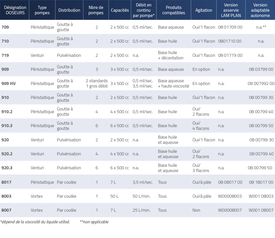 Préconisations produits / machines / doseurs / buses, voir tableaux en bas de page.