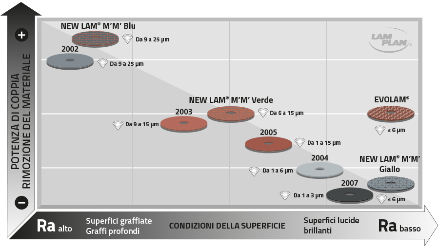 Il piatto NEW LAM® M’M’, frutto della tecnica di abrasione LAM PLAN®, utilizza per il suo funzionamento l’abrasivo diamantato libero. Fin dalla messa in rotazione del disco, sotto l’effetto del peso iniziale dei pezzi e del carico applicato dai pistoni della macchina, i granuli di diamante si spostano e si fissano producendo un’azione abrasiva unicamente sulla faccia dei pezzi da lappare.