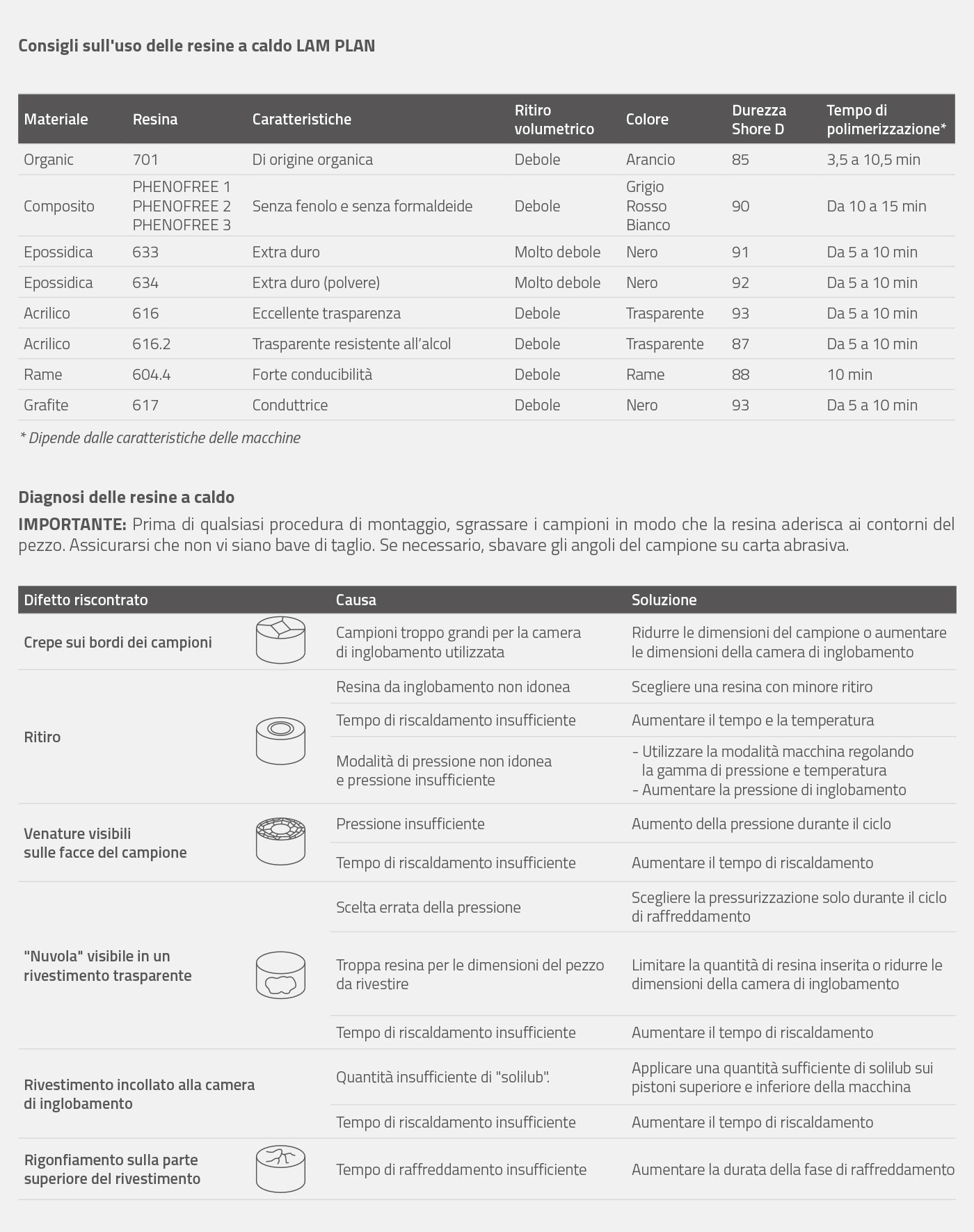 Per rispondere a tutte le situazioni di ricerca e controllo metallografico, LAM PLAN ha sviluppato e testato una gamma di resina caldo che permette di ottenere inglobamenti perfettamente adattati a qualsiasi tipo di studio o tipologia di campione. Ciascuna resina si caratterizza per qualità fisiche e chimiche ben particolari.